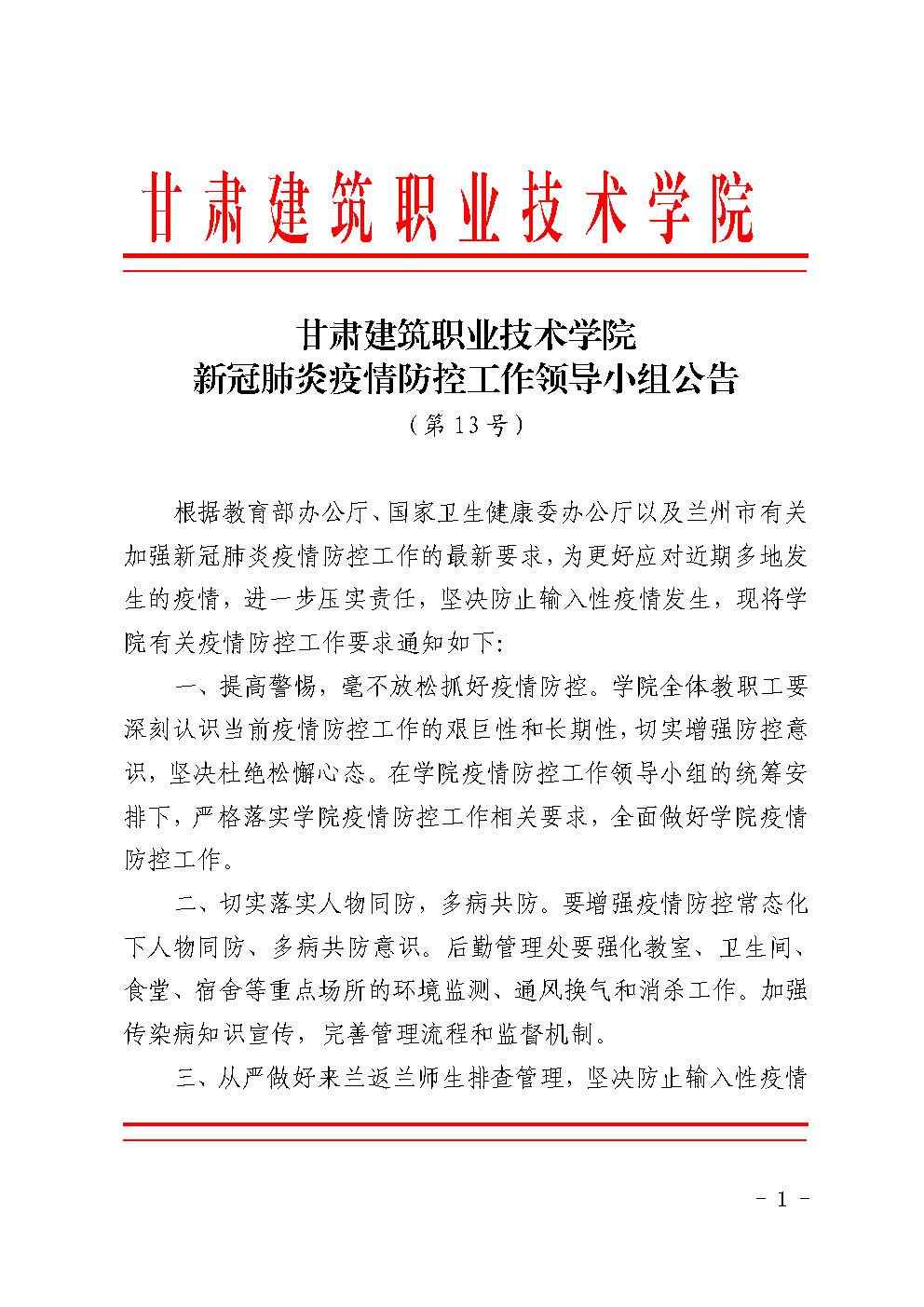 甘肃建筑职业技术学院新冠肺炎疫情防控工作领导小组公告