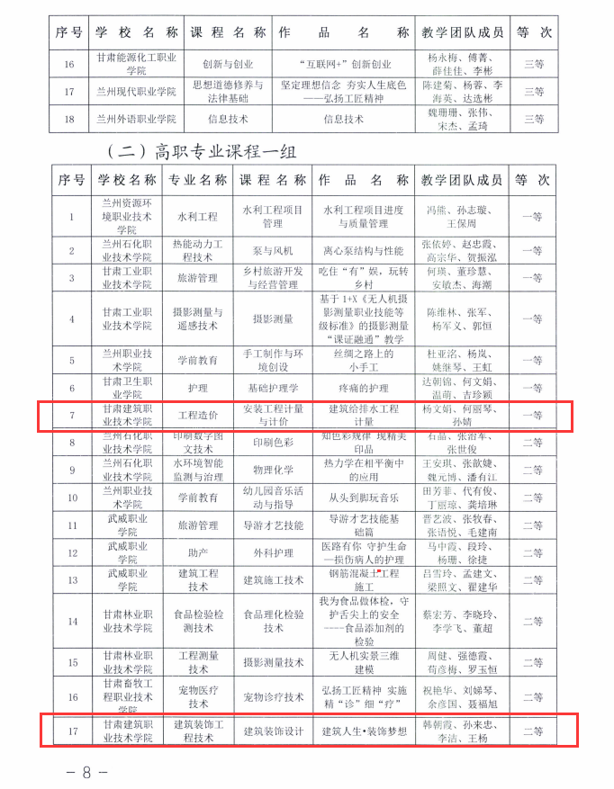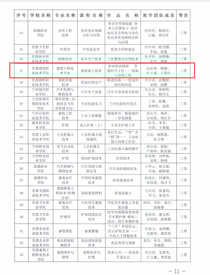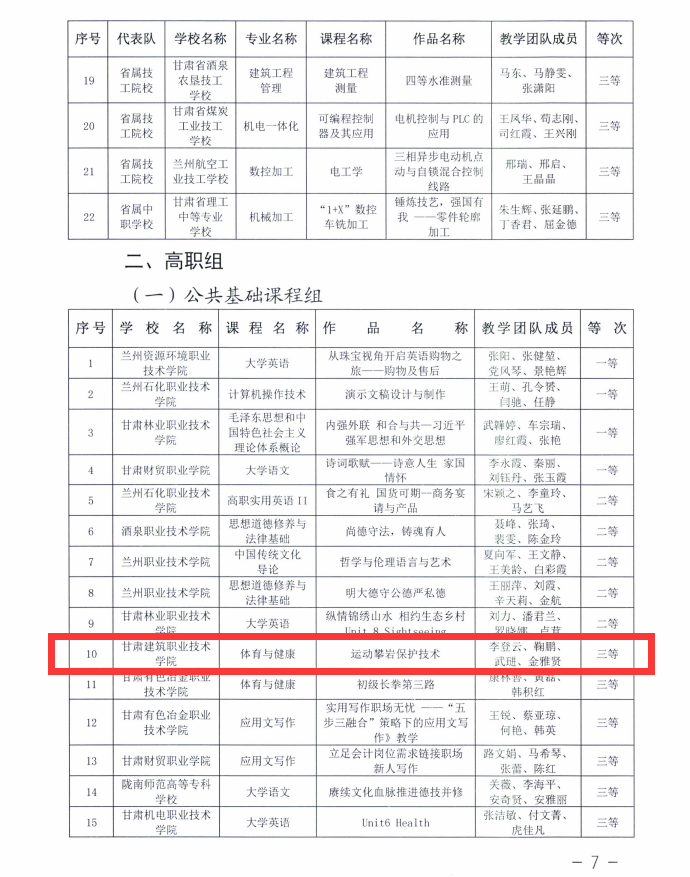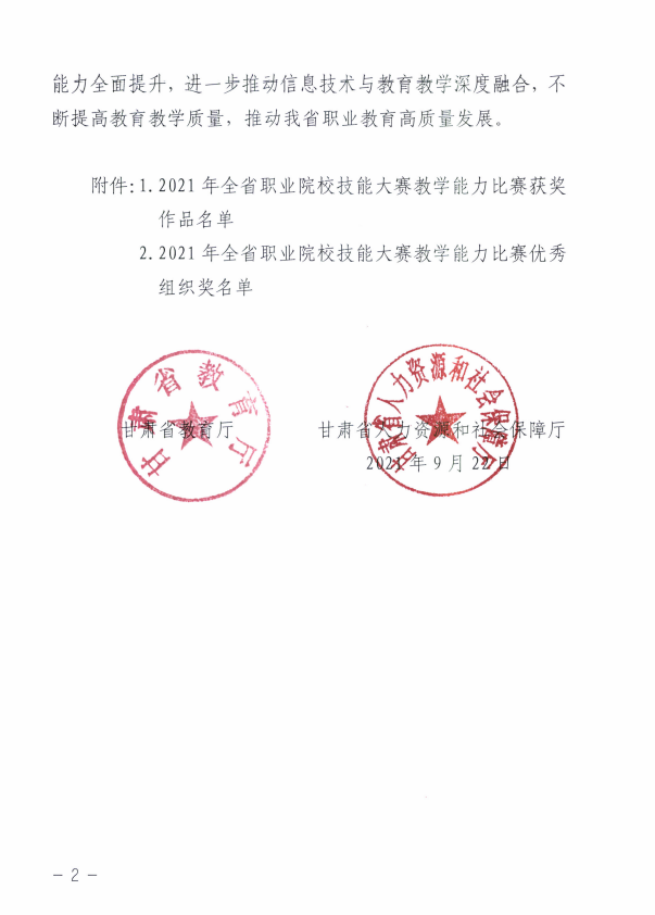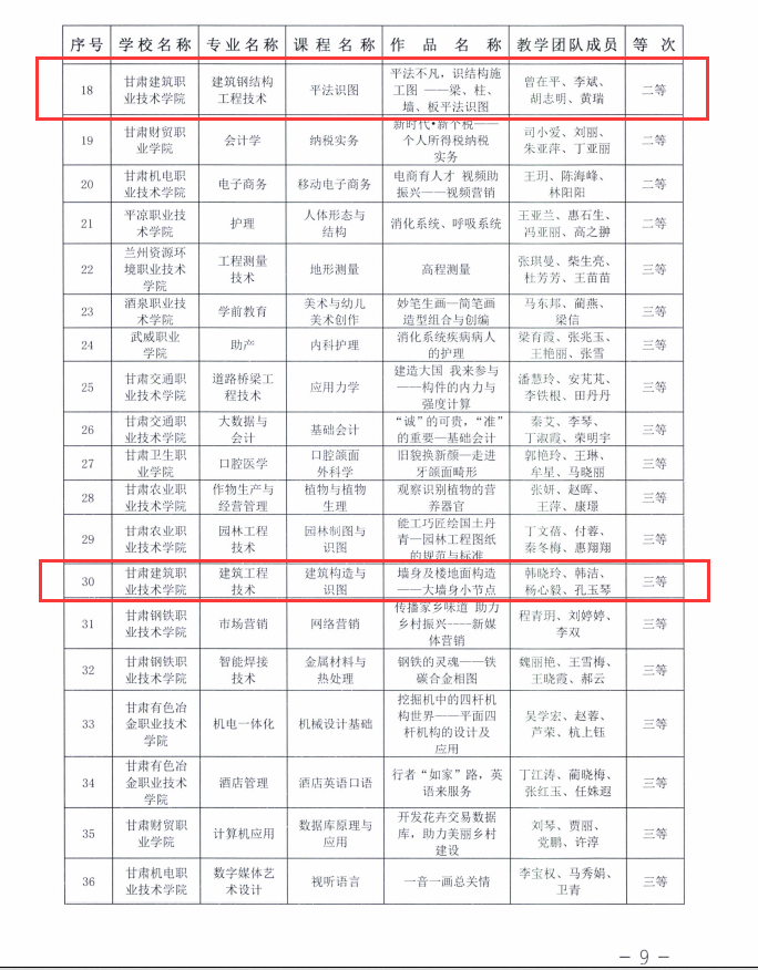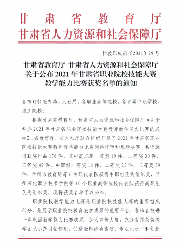 9月22日,由甘肃省教育厅、甘肃省人力资源和社会保障厅联合举办的2021年甘肃省职业院校技能大赛教学能力比赛获奖名单揭晓,我院7个参赛团队全部获奖,其中一等奖2个,二等奖3个,三等奖2个。