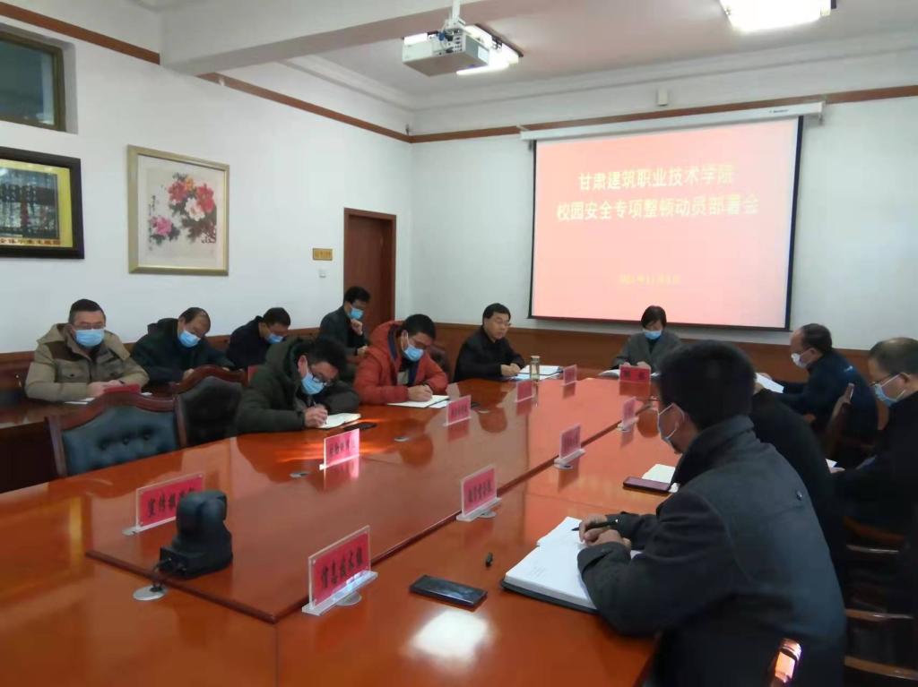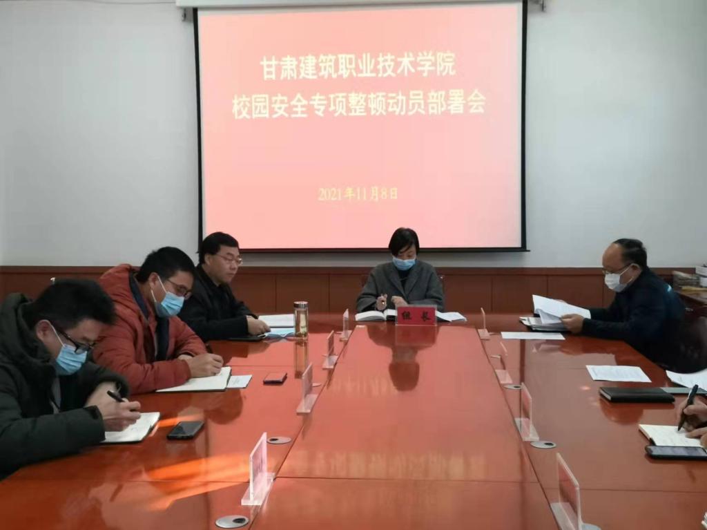 学生工作处处长许庆兵宣读了《甘肃建筑职业技术学院校园安全专项整顿工作实施方案》的通知。《方案》要求,通过开展校园安全专项整顿工作,要查漏洞、补短板,消除各类安全隐患,强化安全工作主体责任,完善安全风险预防机制、防范体系、应急预案,改善校园周边治安环境,提升师生安全素养,增强各类安全风险的防范抵御能力,坚决杜绝一切安全事故发生。此次专项整顿分四个阶段在兰州校区与康乐校区同步开展,即动员部署阶段、自查自改阶段、整改完善阶段和总结提升阶段。整顿重点内容包括安全责任落实情况;校园治安防控情况;校内及周边隐患整治情况;涉校违法犯罪防范治理情况;安全教育落实情况;心理健康教育落实情况;食品安全管理情况;消防和用电安全管理情况;交通安全管理情况;教学设施与实训室安全管理情况;建筑与施工安全管理情况;维护国家政治安全工作情况等12项。