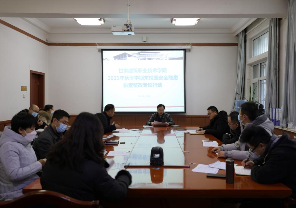 1月6日,甘肃建筑职业技术学院召开了2021年秋季学期末校园安全隐患排查整改专项会议,并对校园安全工作进行了实地摸排,学院党委委员、副院长高忠有,学院安全领导小组成员等相关部门负责人陪同。