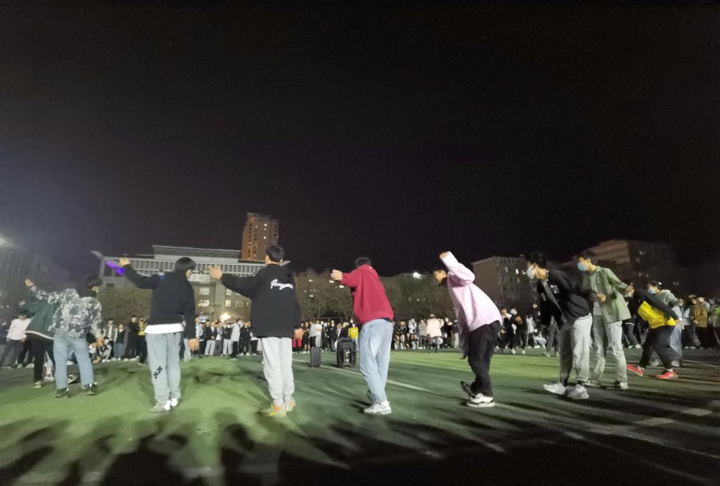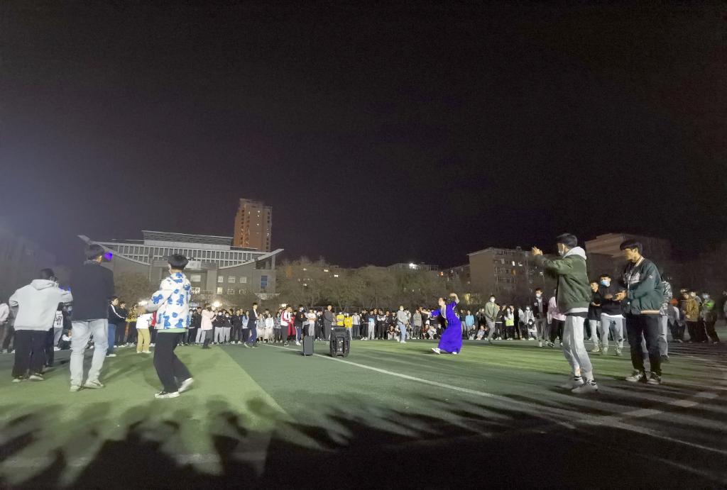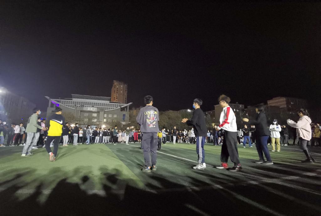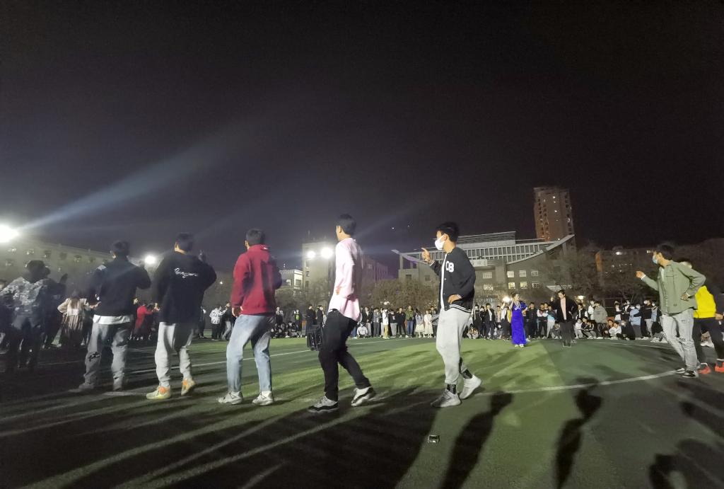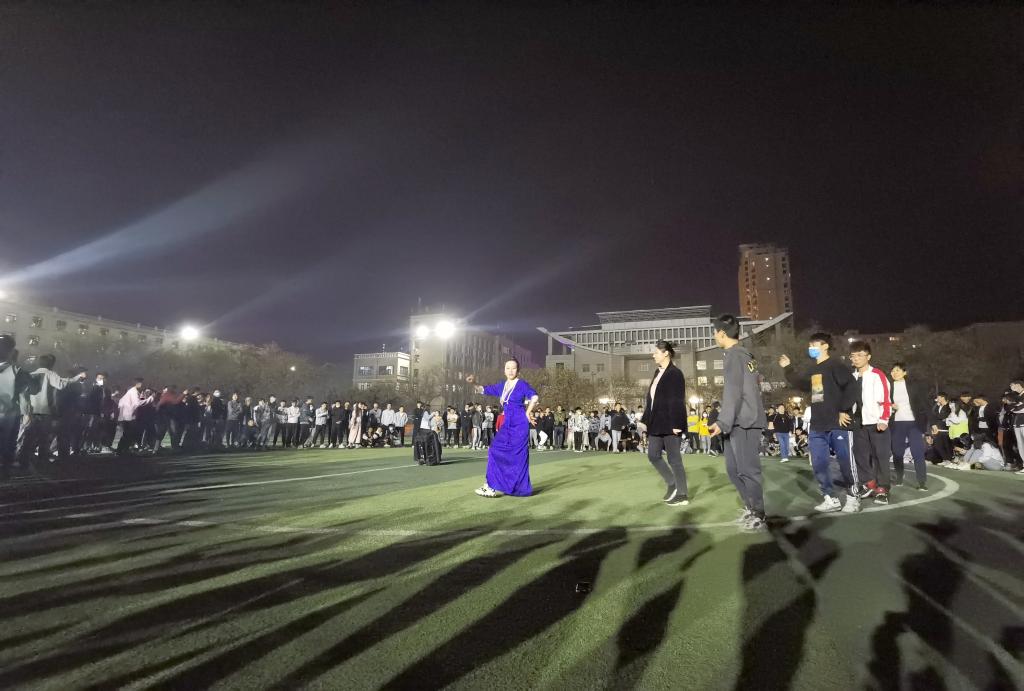 晚上9点,学院操场灯火通明。同学们伴着铿锵的音乐,挥舞着手臂,踏着明快的节奏,围成一圈,欢快地跳起了锅庄舞。熟练锅庄舞的同学在中间围成一个小圈领跳,仅仅一会功夫,就有很多的学生加入到了锅庄舞的队伍中来翩翩起舞,现场的氛围热烈祥和。王阳同学连跳了一会后说,锅庄是凝聚人气、精神的艺术,是人际交流和文化交流的重要形式,是展示希望和理想的平台。锅庄舞旋律优美干净,生活气息浓郁,具有向心力和凝聚力。通过参加这样的活动,将使疫情期间同学们团结的更加紧密,同时也能锻炼身体,让我们开心生活、学习。