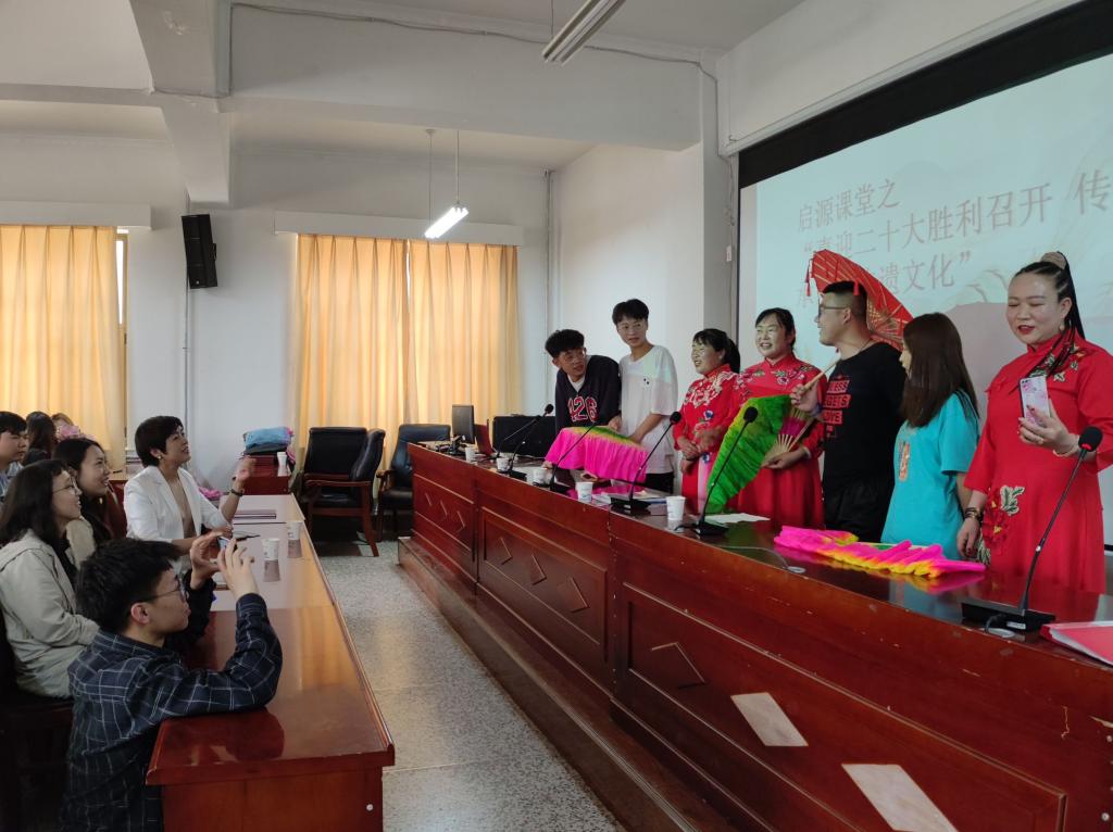 活动特别邀请到中国民间文艺家协会会员、国家非物质文化遗产省级传承人文香莲老师主讲。活动中,文香莲老师及其学生向同学们介绍了莲花山花儿,告诉同学们花儿演唱不但需要独特的嗓音,还要掌握好演唱技巧,因为每一种音乐都有其内在的演唱要求,只有领会了这些要领,才能唱出花儿的本质。以前她在莲花山、黄河边等地唱花儿,现在凭借网络,可以随时随地唱花儿,莲花山花儿通过网络传遍天下。文香莲老师带领徒弟们,以悠扬的花儿格调,唱响新时代农村幸福美好生活。