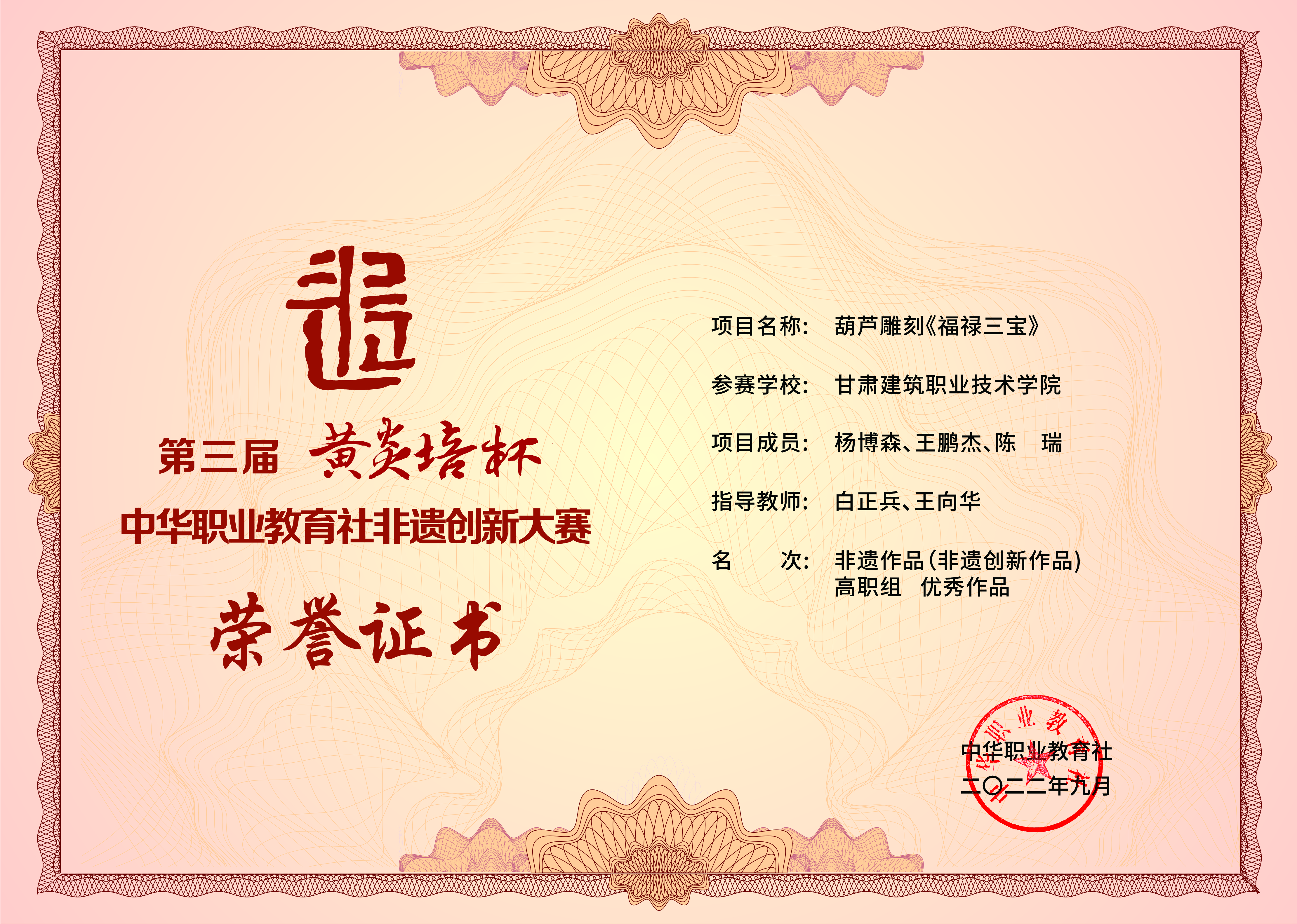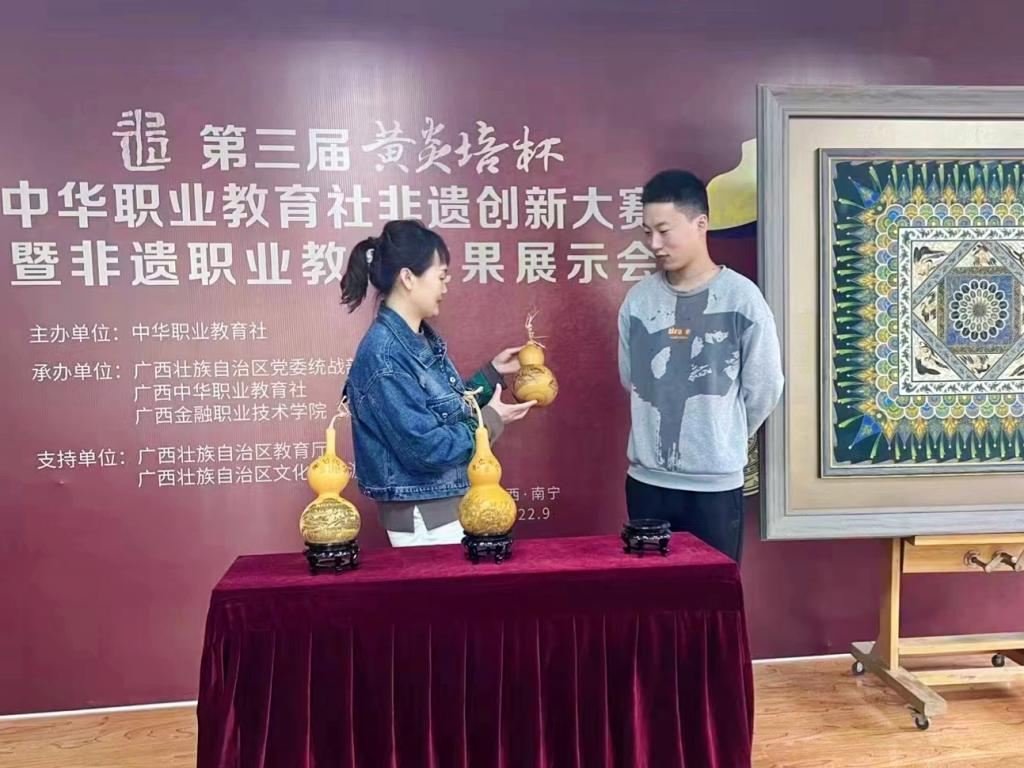 近日,由中华职业教育社主办的第三届“黄炎培杯”中华职业教育非遗创新大赛暨非遗职业教育成果展示会在南宁落幕。此次大赛中,我院共入围四组非遗创新作品,其中建筑系主任杨晶、陇派珐琅工艺师王淑丽指导,学生房兰兰、孟玉龙、孙凯完成的作品掐丝珐琅--《莲花化生莫高窟藻井》荣获一等奖;建筑系党总支书记蔡萍与甘肃省工艺美术大师、陇派珐琅非遗传承人李海明指导,学生王陆、李婕完成的作品掐丝珐琅--《莲花飞天莫高窟藻井》荣获一等奖;建筑系老师王向华、甘肃省高级葫芦雕刻艺术师白正兵指导,学生杨博森、王鹏杰、陈瑞完成的作品葫芦雕刻《福禄三宝》荣获优秀奖。
