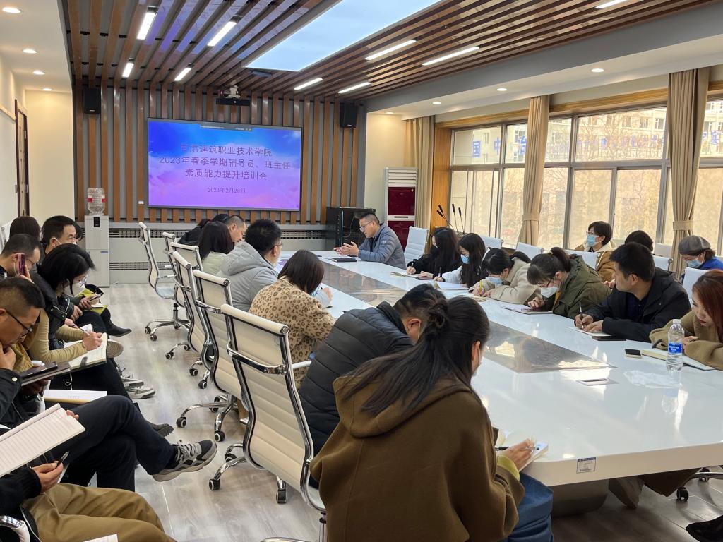 2月28日下午,学院在体育馆二楼大学生素质与能力提升基地召开了2023年春季学期辅导员、班主任素质能力提升培训会,校本部全体一线专、兼职辅导员,班主任以及学生工作科人员参加了会议。会议由学生工作科科长许庆兵主持。