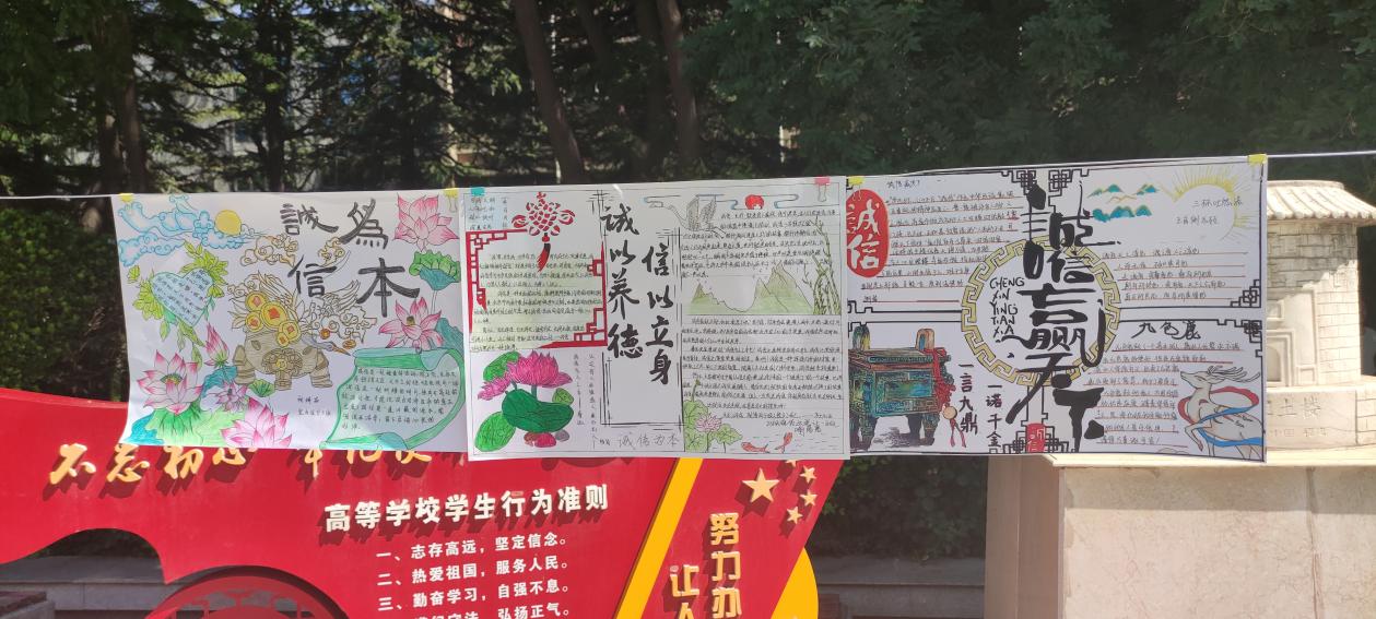 本次“诚信教育”活动的主题是“践行诚信 筑梦起航”。活动内容主要包括“诚信离我有多远”主题班会、“防范电信网络诈骗 共建平安和谐校园”法制宣讲、“诚信爱成长”手抄报比赛、“我诚信 我骄傲 我文明 我自豪”微视频作品征集大赛、“践行诚信 感恩资助”的诚信还贷教育讲座。主题班会的召开,在宣传各类政策的同时,也增强同学们的“诚信”意识,引导同学们从自身做起,从身边的每件小事做起;民警通过进校园现场发放防诈骗宣传手册,进宿舍手把手教学生如何使用“反诈APP”等形式,与学生面对面进行宣传教育,宣讲效果良好;“诚信爱成长”手抄报比赛,征集作品90多篇,评选22幅优秀作品。将同学们的作品在校园内进行展出宣传;“践行诚信 感恩资助”主题讲座让大家知道违规违约的严重性,明白失信可能造成的后果,极大的在思想上促使受助学生树立诚信观念,增强法律意识。