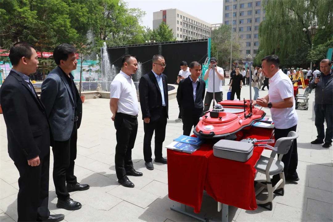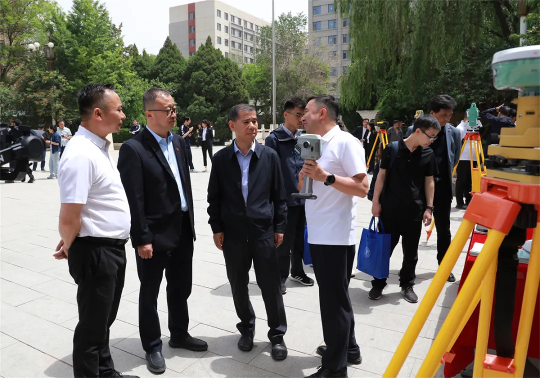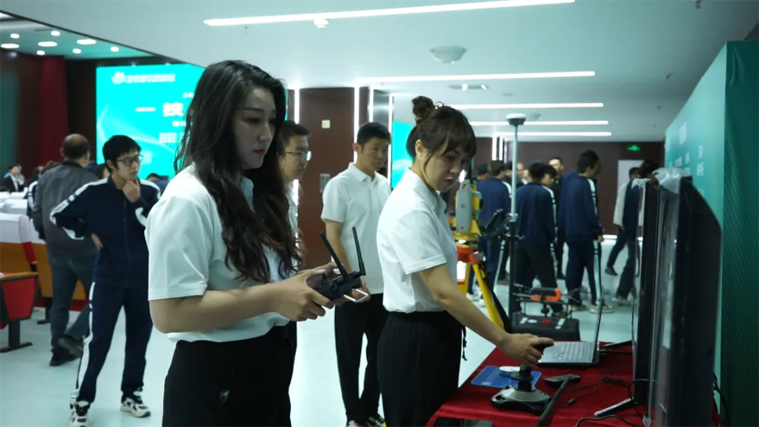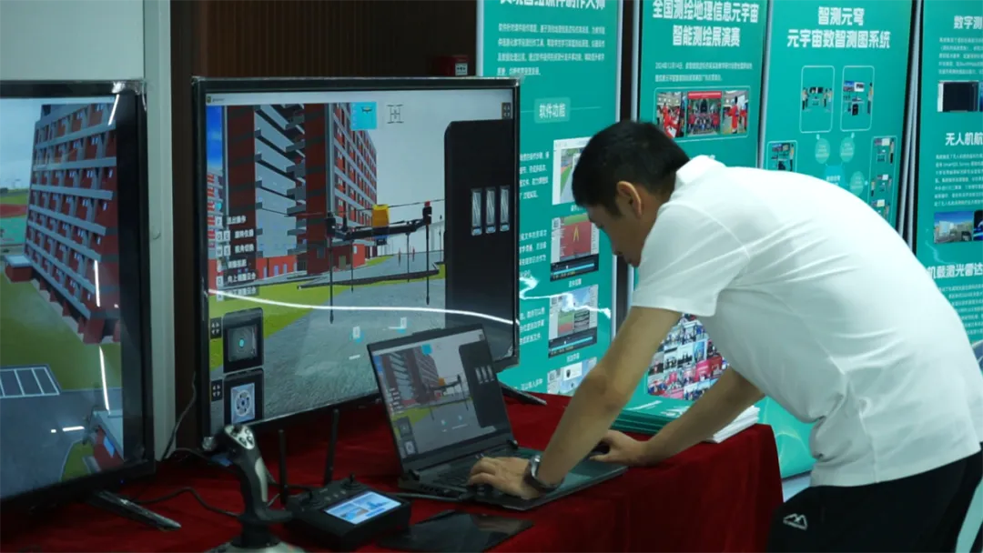 在启动仪式现场一角,南方测绘集团技术工程师正在开展元穹、元宇宙智能测绘展演,通过虚实结合,展示了无人机、三维激光、RTK、全站仪等测量新技术操作,并提供线上虚拟仿真、线下虚实云协同相结合的专用实训教学环境,展演了控制、水准、导线、测图、航测、工程测量等实训项目的开展。