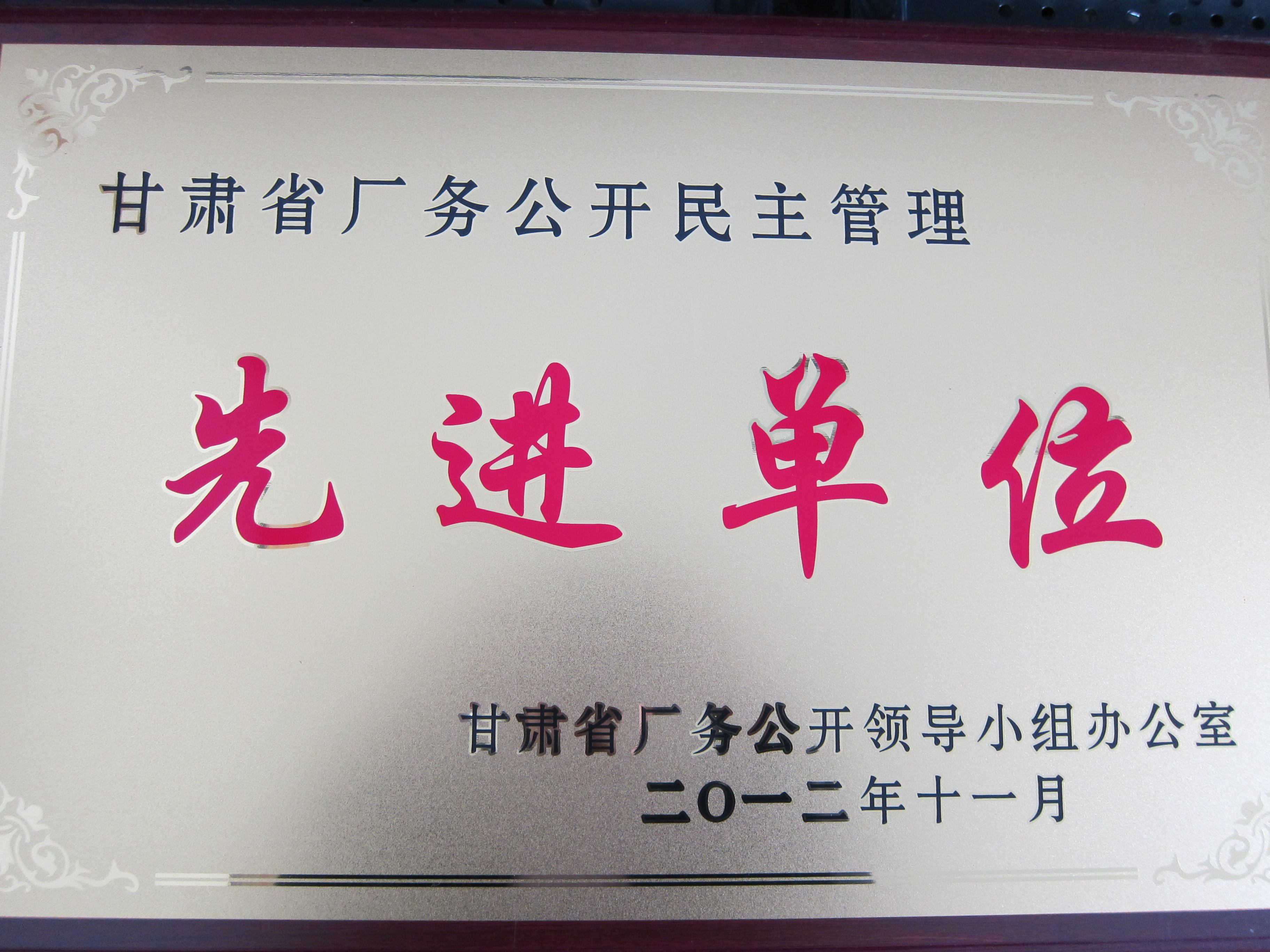2013年初,甘肃省厂务公开领导小组办公室表彰了“甘肃省厂务公开民主管理先进单位”、“甘肃省推动厂务公开民主管理工作先进单位”和“甘肃省厂务公开民主管理工作先进个人”,我院荣获“甘肃省厂务公开民主管理先进单位”称号。