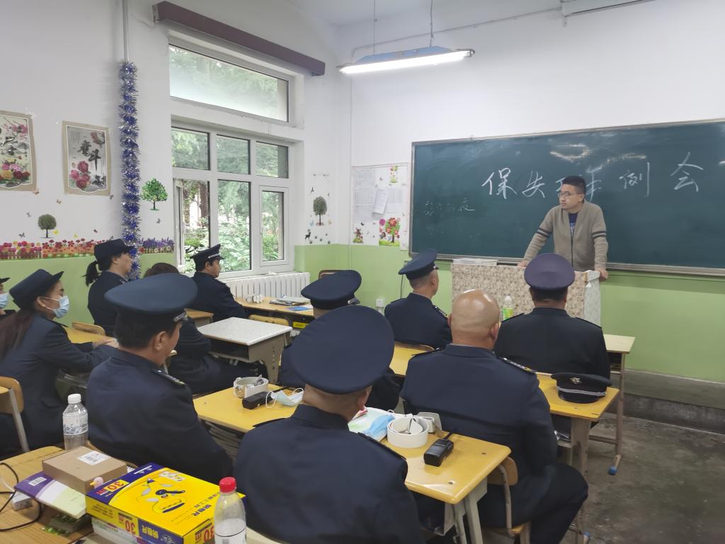 第一项首先由学院保卫处处长郝昭、副处长秦勇对近期保安人员在疫情管控、敏感节点、消防管理、治安管理、宿舍安全管理等方面大家出现的问题进行了分析,对大家饱满的热情、诚挚的付出,代表学院表示了肯定,也对未来安保工作的更好更快的发展有所期待。