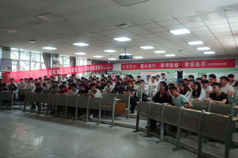 2019年5月23日11:50联合晏家坪街道中院社区,在学院文化广场进行以“开展扫黑除恶专项斗争、创造安全稳定社会环境”为主题的宣传活动,活动中社区与学院保卫处工作人员组织学生进行了问卷调查、发放传单、现场讲解等活动。14:20学院保卫处、宣传部及社区宣传人员,深入学生宿舍进行了宣传、问卷调查及讲解。14:30兰州市扫黑除恶宣讲团领导李琳在晏家坪街道党工委书记杨秉培、晏家坪扫黑除恶专项斗争办公室主任石鑫及学院扫黑除恶办公室成员的陪同下,代表兰州市扫黑除恶专项斗争宣讲团,在我院阶梯一教室为学院师生代表进行了以“严惩黑恶势力、维护社会稳定”为主题的报告会。