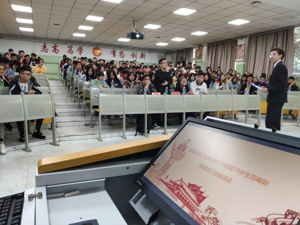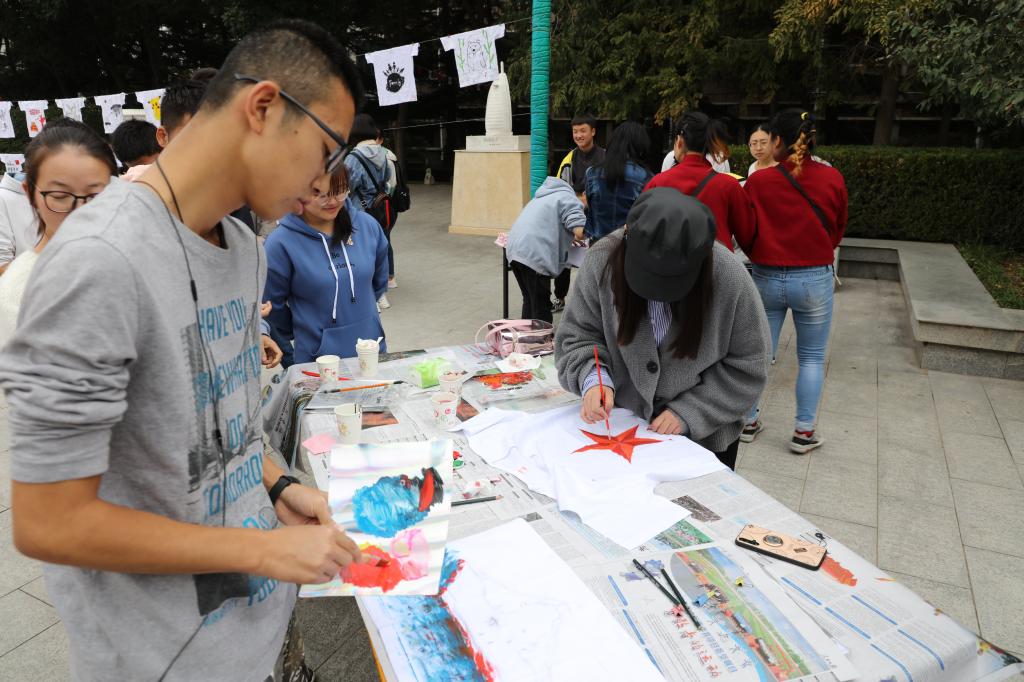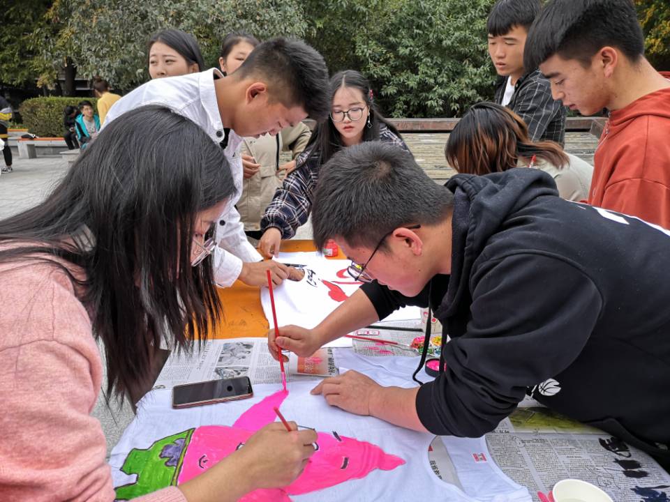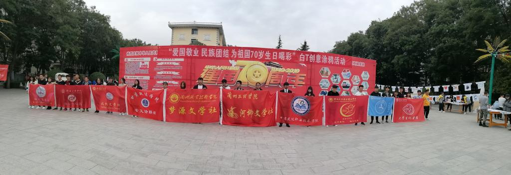 在庆祝中华人民共和国成立70周年华诞之际,10月13日,由图书馆、团委主办,文启读书协会承办的以“不忘初心、牢记使命,为祖国70岁生日喝彩”为主题的白T创意涂鸦活动在学院风雨广场举办。