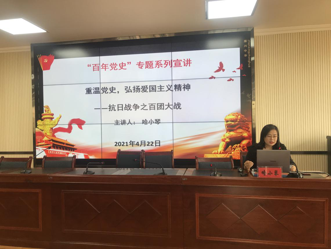 “百年党史”专题系列宣讲活动的第一讲由思政部骨干教师哈小琴老师主讲,主题为《重温党史,弘扬爱国主义情怀——抗日战争之百团大战》。讲座内容以还原历史的方式,再现百团大战中的感人画面,让广大师生走进历史、重温历史,弘扬爱国主义精神,赢得了大家的一致好评。
