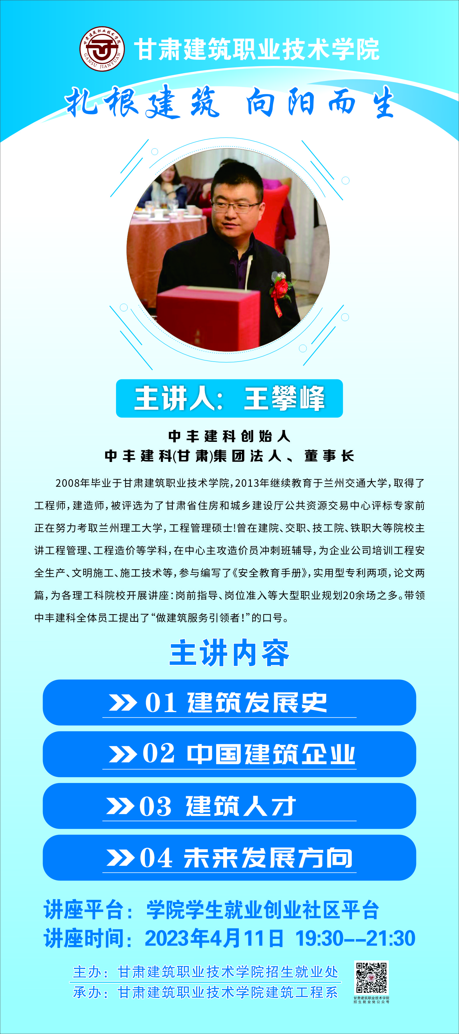 【三抓三促】关于举办学生就业创业社区建设第五场就业指导服务讲座的通知 日期:2023-04-10 来源: 根据学院学生就业创业社区建设内容要求,定于4月11日19:30举办第五场就业指导讲座,现将有关事项通知如下: 一、讲座内容:《扎根建筑、向阳而生——建筑类院校学生走向岗位后可持续发展》 二、主讲人:王攀峰 中丰建科(甘肃)集团董事长、学院2008届毕业生 三、参与学生:全校大二学生 四、直播路径:微信搜索甘肃建筑职业技术学院微信公众号→学生社区→就创社区→登录账号(学号)→应用→位来播客