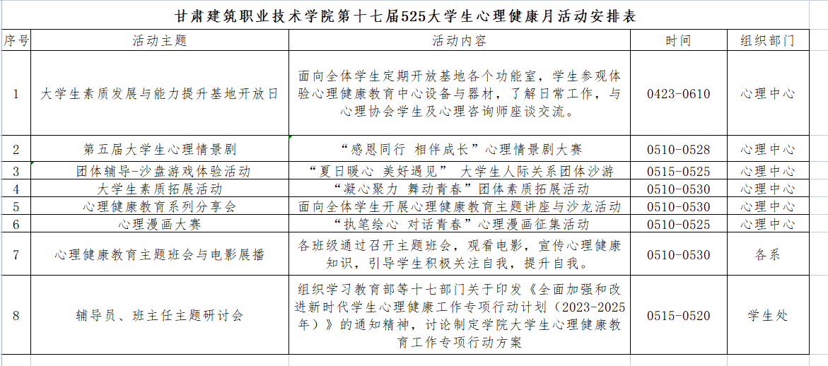 本届大学生心理健康月活动经过前期筹备,精心组织,现由八项内容组成,形式多样,内容丰富,积极营造全员参与、学生受益的良好氛围。