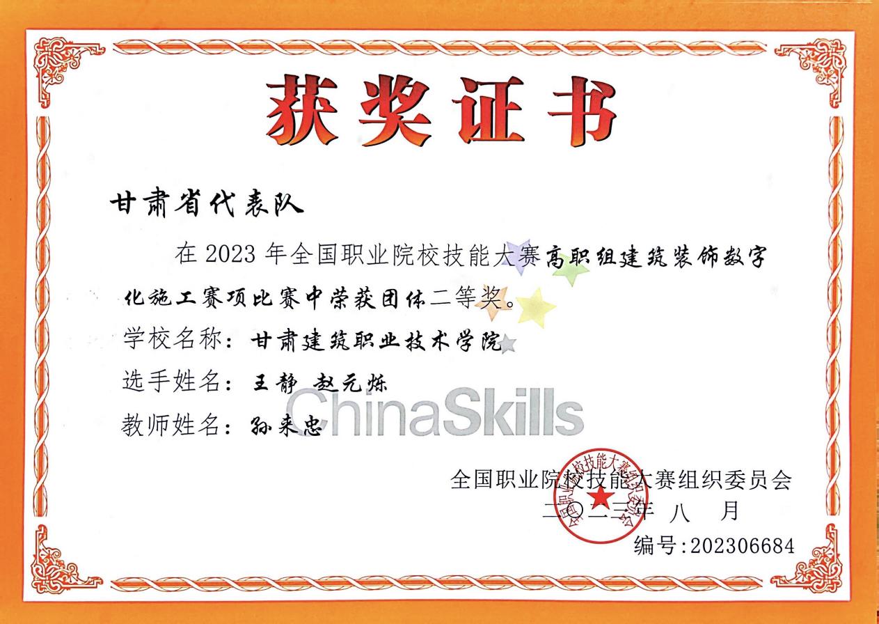 经过激烈角逐,最终共有36所高校参赛队获奖,由我院建筑系副主任孙来忠带领学生王静和赵元烁同学组成的参赛队荣获二等奖,全国第14名,实现了我院在该赛项上零的突破,也是今年该赛项西北省份最好成绩。
