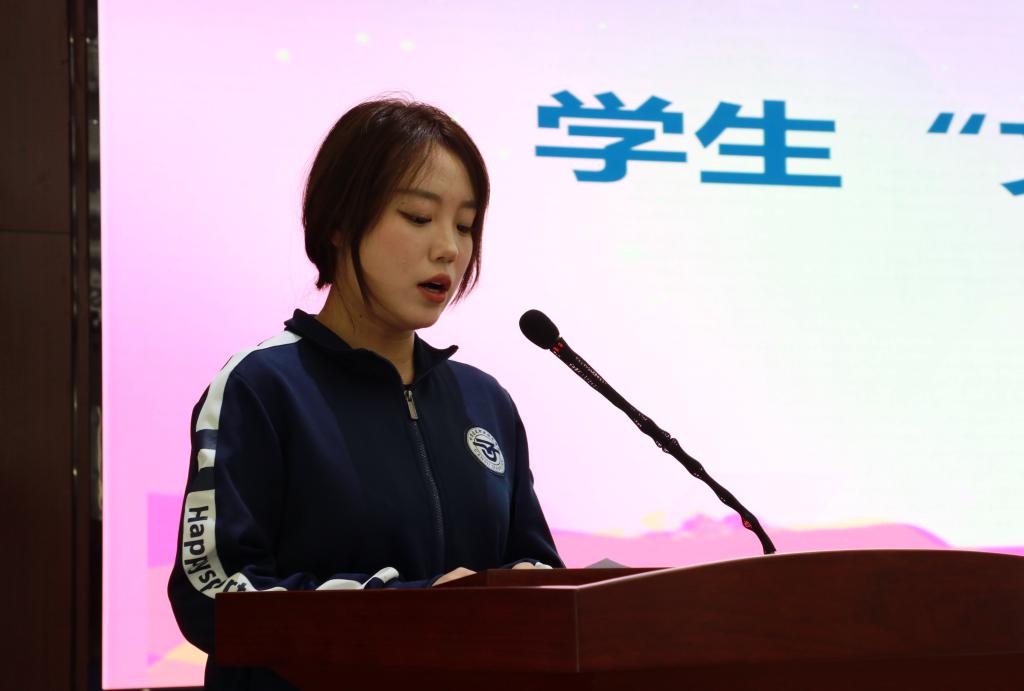 2023级电子商务1班袁艺菡宣读了文明校园创建倡议书。她倡议大家从文明课堂、文明用餐、文明宿舍和文明个人出发,共同努力为文明校园添彩,也为自己的人生添彩。