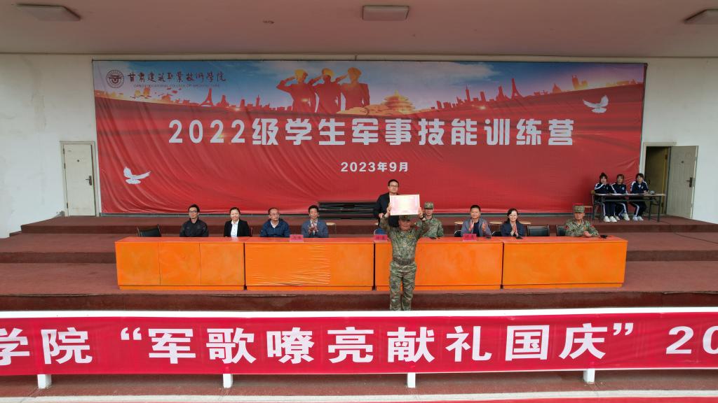 歌声嘹亮唱响青春,心情澎湃放飞梦想,9月22日上午,学院“军歌嘹亮献礼国庆”2022级学生军训歌咏比赛在风雨大操场火热举行。承训部队负责人武威军分区天祝县人武部副部长军训团团长王雄兄同志、学院学生工作处处长军训团政委许庆兵同志出席,军训团全体教官、营教导员、全体连队指导员以及2022级学生共计3700余人参加了比赛。